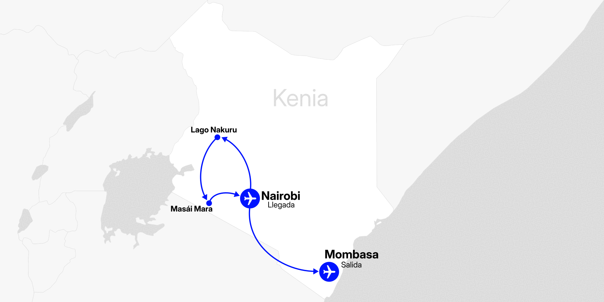 Nairobi - Parque Nacional del Lago Nakuru - Reserva Natural Masái Mara - Diani Beach