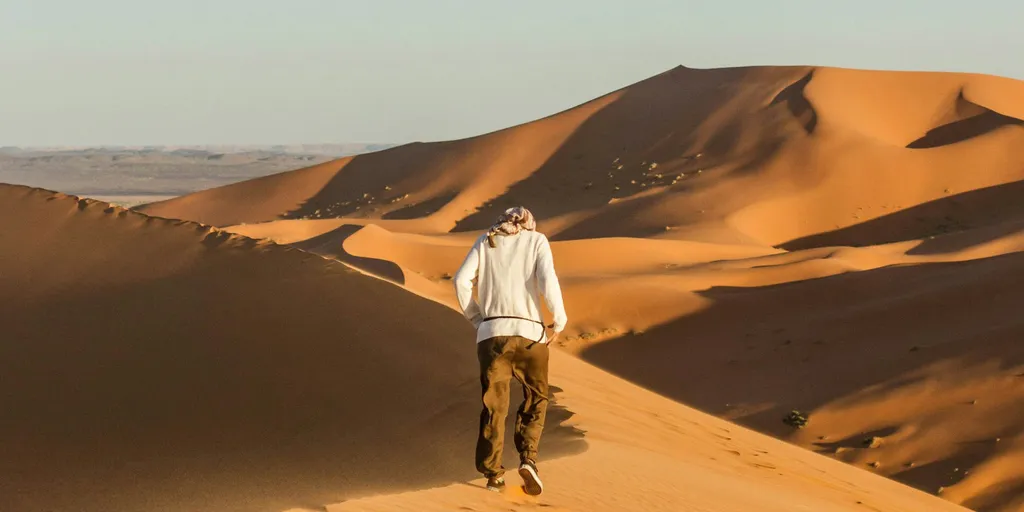 Alcanzaremos el Palmeral de Zagora, donde haremos una pausa para almorzar, y luego continuaremos hacia la ciudad de Zagora. Atravesaremos paisajes de aspecto lunar hasta llegar a las dunas de M'Hamid, donde nos esperan los dromedarios que nos llevarán durante unos 20 minutos hasta nuestro campamento.