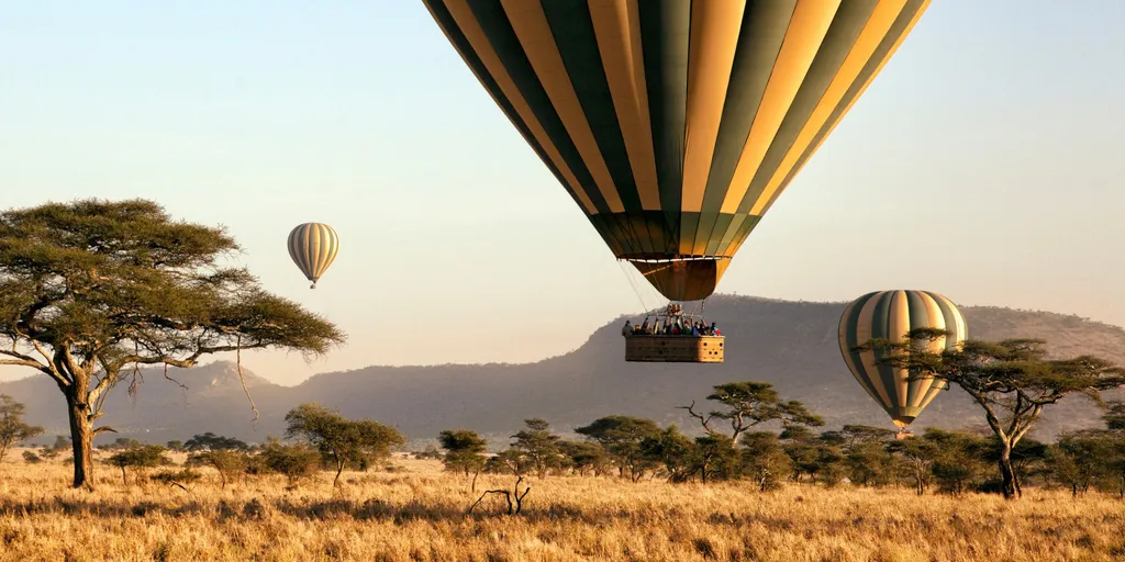 Al amanecer, nos embarcaremos en una aventura inolvidable. Disfrutaremos de un safari a bordo de un globo aerostático, donde podremos admirar las inabarcables llanuras del Parque Nacional de Serengeti teñidas de dorado por los primeros rayos de sol del día.