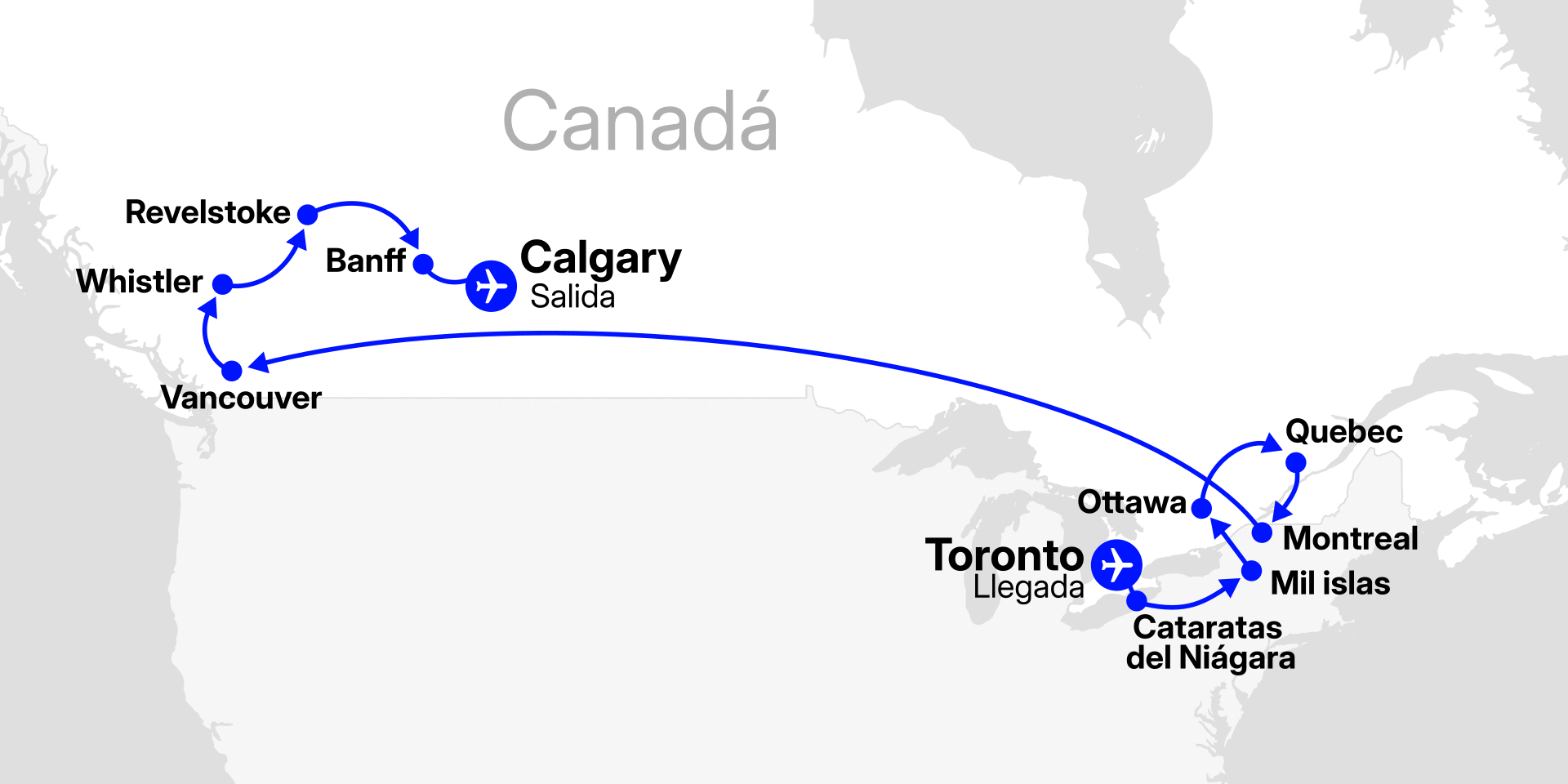 Este viaje organizado por Canadá ofrece una inmersión completa en la diversidad del país, conectando la sofisticación de la costa este con la majestuosidad natural del oeste. En Toronto, descubriremos una metrópoli global antes de navegar junto a las Niagara Falls. La ruta cultural nos llevará por la capital, Ottawa, y las históricas ciudades de Quebec City y Montreal, espacios en los que la herencia francesa se manifiesta en cada calle. Al saltar hacia las Montañas Rocosas de Canadá, exploraremos los Parques Nacionales de Banff y Jasper, recorriendo la mítica Icefields Parkway y caminando sobre el hielo del Glaciar Athabasca. Atravesaremos el imponente Mt. Robson y la cordillera costera en Whistler, para finalizar en Vancouver, ciudad referente por la calidad de vida y el entorno natural privilegiado. Un circuito de dieciséis días diseñado para quienes buscan la aventura definitiva en el gran norte.