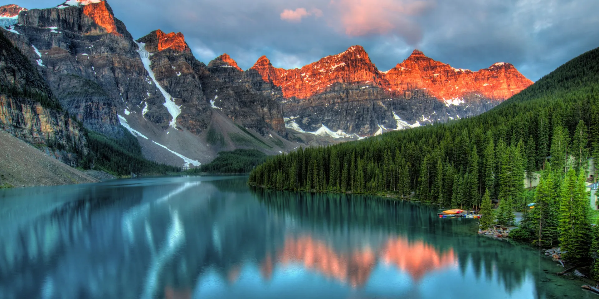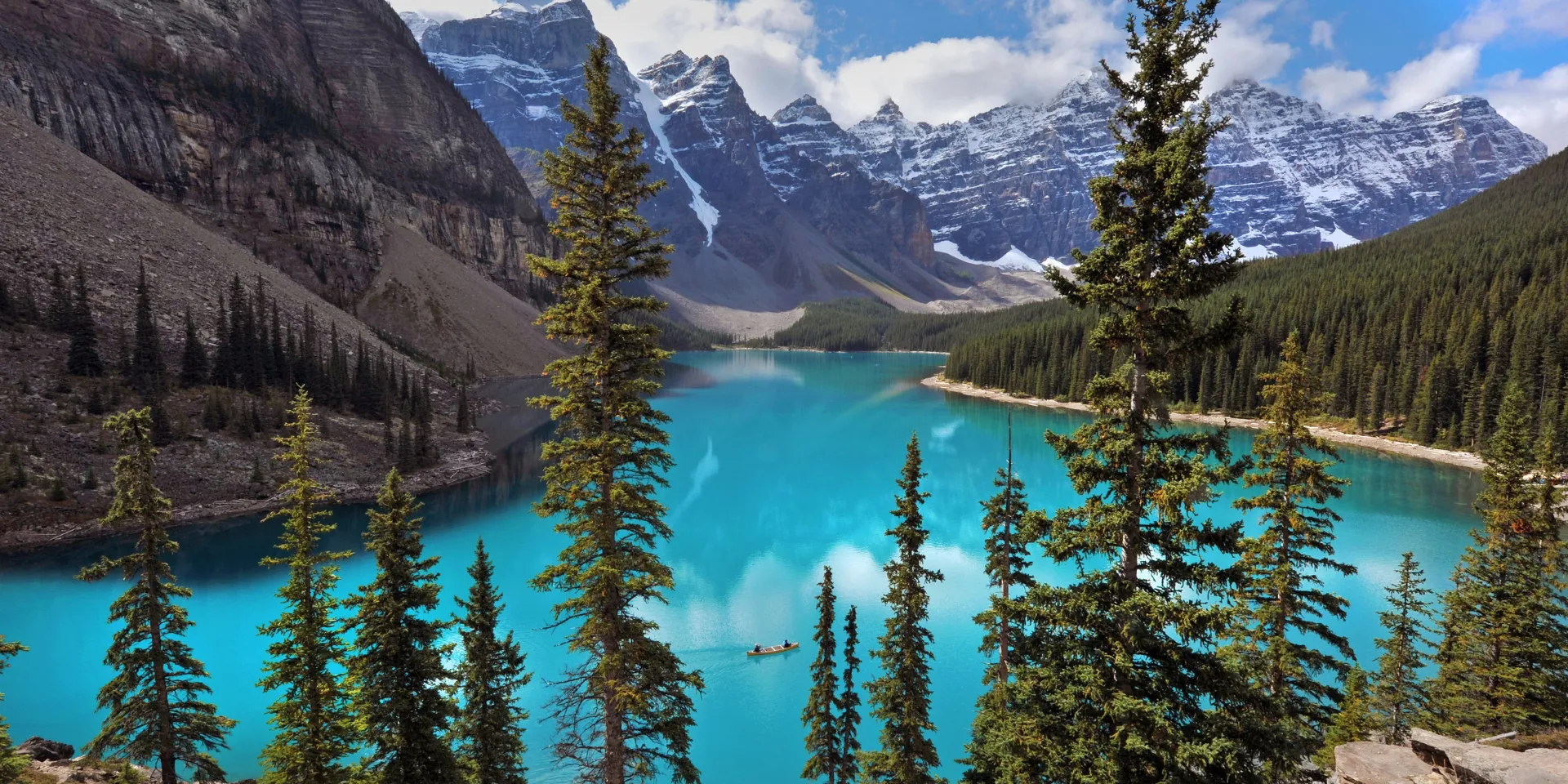También descubriremos el Lago Moraine, enmarcado por el Valle de los Diez Picos, una formación geológica que define la silueta de las Montañas Rocosas.