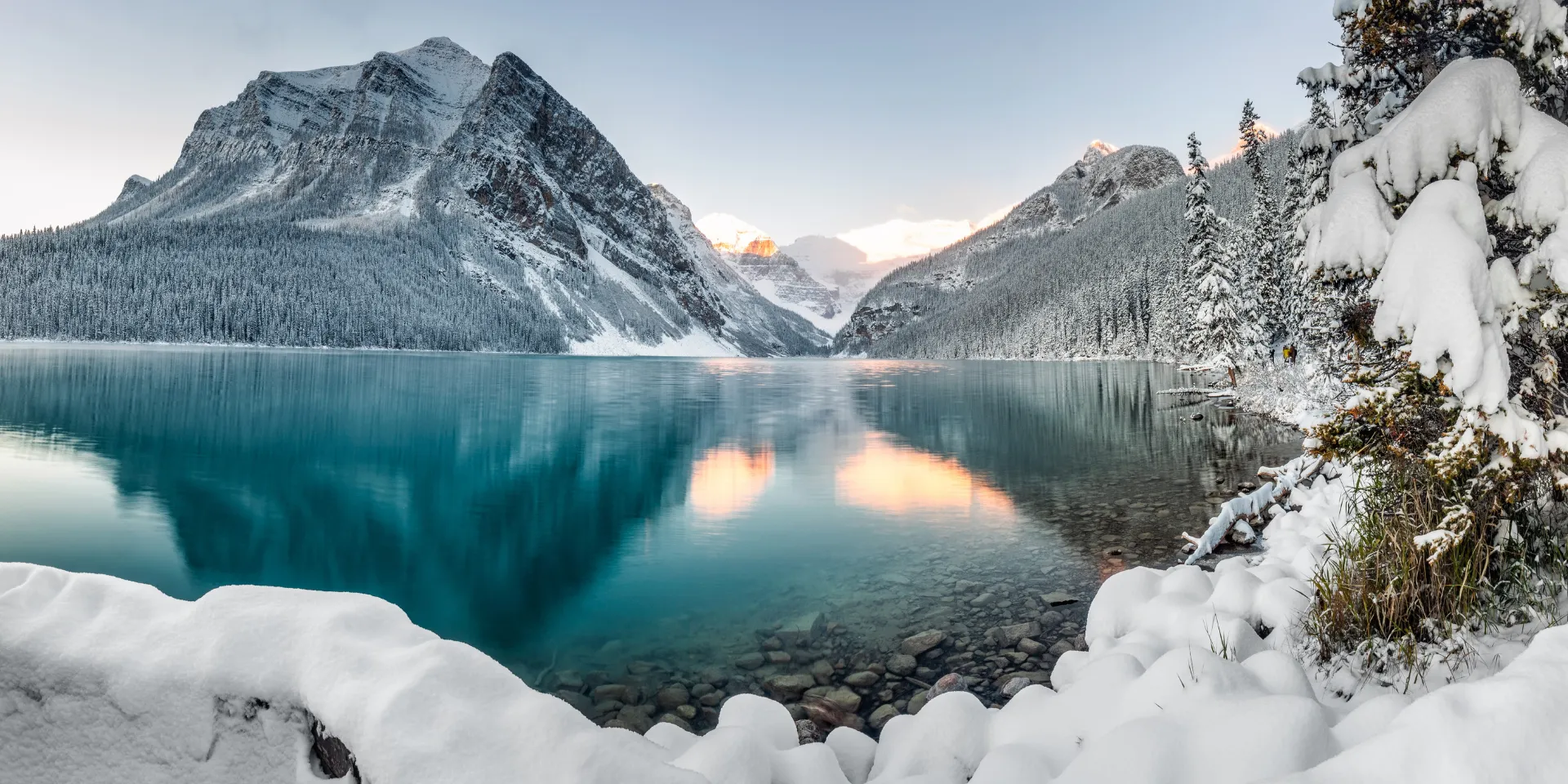 Pondremos rumbo a las Montañas Rocosas atravesando el Paso Rogers, situado en el corazón del Parque Nacional de los Glaciares. Visitaremos el enclave más reconocido de la región: Lake Louise, donde el Glaciar Victoria se refleja en aguas de color turquesa debido al polvo de roca en suspensión.