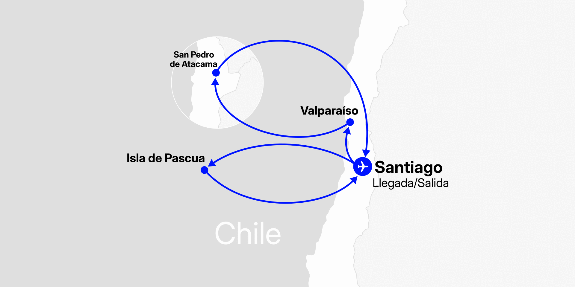 Desde el bullicio de la capital hasta los paisajes volcánicos del Pacífico, nuestro viaje organizado a Chile comienza en Santiago de Chile, donde las avenidas se mezclan con barrios bohemios. Descubriremos la esencia portuaria de Valparaíso y la costa de Viña del Mar, antes de volar hacia el Triángulo Polinésico. En la Isla de Pascua (Rapa Nui), nos acercaremos a los moáis y sus leyendas visitando la aldea de Orongo, la cantera de Rano Raraku y la majestuosidad de Ahu Tongariki. Los paisajes del volcán Rano Kau y la serenidad de la playa de Anakena serán el final perfecto para nuestro Viaje de 9 días a Chile, tras una inmersión completa en la arqueología, la naturaleza y la hospitalidad local.
