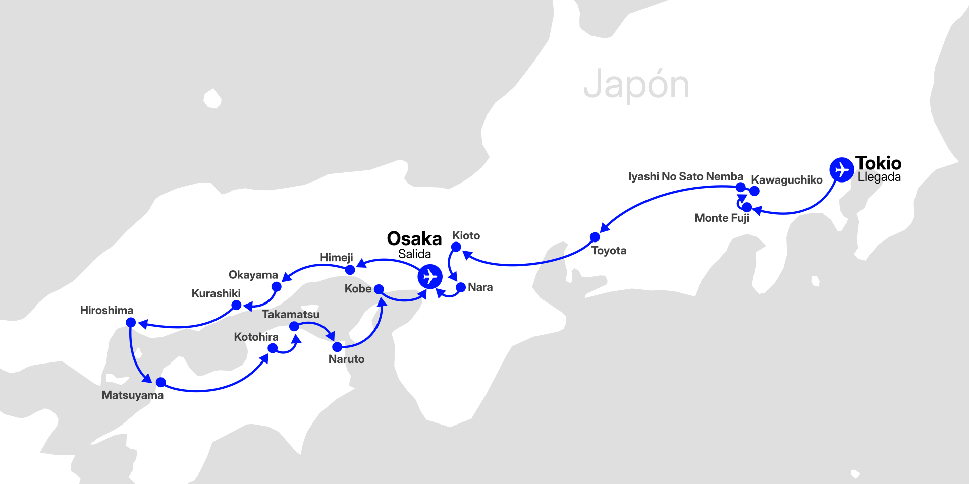 Tokio - Monte Fuji - Kawaguchiko - Iyashi No Sato Nemba - Toyota - Kioto - Nara - Osaka - Himeji - Okayama - Kurashiki - Hiroshima - Matsuyama - Kotohira - Takamatsu - Naruto - Kobe - Osaka