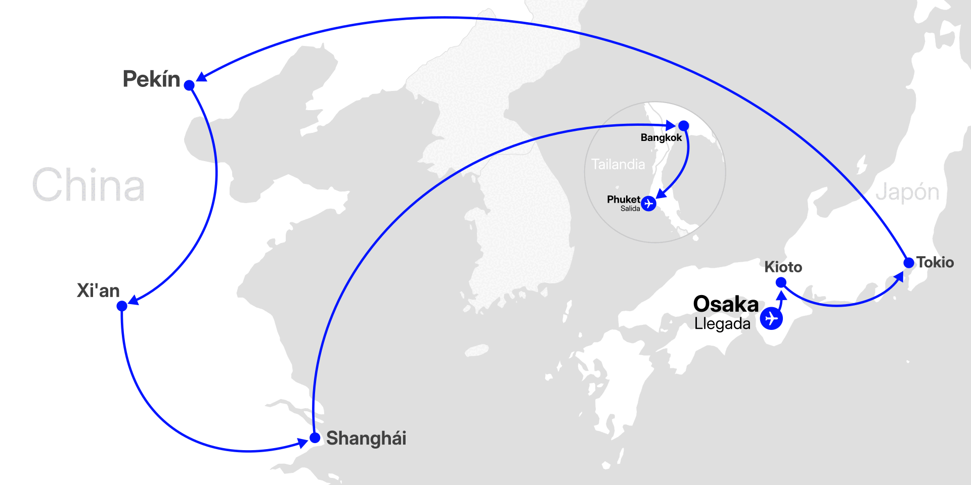 Santuarios que guardan secretos milenarios, palacios imperiales, ciudades futuristas y playas turquesas rodeadas de selvas tropicales. Nuestro viaje a Japón, China y Tailandia comienza en la vibrante Tokio, descubriendo el santuario Meiji, los jardines del Palacio Imperial y el Sensoji, el templo budista más antiguo de la ciudad. En Hakone admiramos el imponente Monte Fuji y el Lago Ashi, y luego nos adentramos en los valles volcánicos de Owakudani, rodeados de fuentes termales. Un tren bala nos lleva hacia Kioto para perdernos entre bosques de bambú y santuarios asombrosos como el Fushimi Inari. En Nara visitamos el Parque de los Ciervos, considerados mensajeros de los dioses. Continuamos en Kanazawa, descubriendo casas de té tradicionales y barrios de geishas. Además, visitamos Gero, Nagoya y Osaka, donde paseamos por el barrio de Dotonbori, entre canales fluviales y puestos de comida callejera. La travesía continúa en Pekín donde veremos la Ciudad Prohibida, el Templo del Cielo y el Palacio de Verano. Exploramos los senderos de la Gran Muralla China, la mayor obra de ingeniería del mundo. En Xi´an, veremos a los Guerreros de Terracota, esculturas ocultas bajo tierra por más de dos mil años. Shanghái nos espera para perdernos entre rascacielos, templos y el icónico Bund, a orillas del río. La ruta sigue en Bangkok, la agitada capital tailandesa, paseando entre motos, rascacielos y luces de neón. Visitamos palacios imperiales y templos emblemáticos como el Wat Pho o templo del Buda reclinado. Finalmente, tendremos tiempo para descansar en las playas de Phuket, al sur de Tailandia. Podremos conocer Krabi, con sus acantilados de piedra caliza, islas escondidas y playas de aguas cristalinas, o Koh Samui, famosa por sus palmeras infinitas, templos budistas y spas junto al mar.