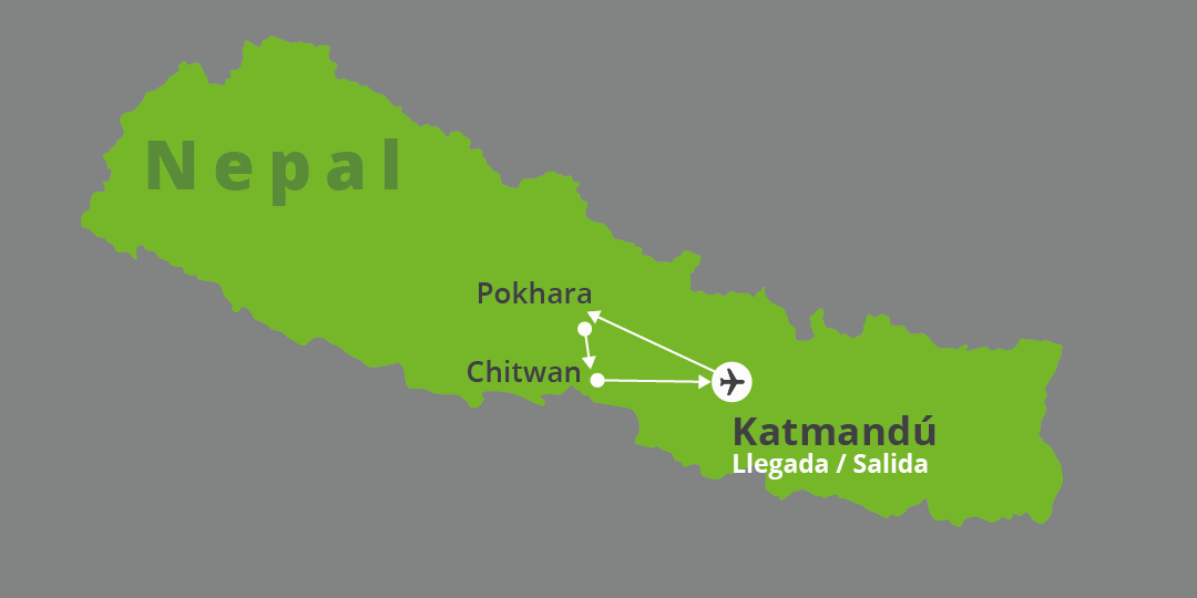 Vuelos internacionales, traslados según itinerario, alojamientos con desayuno, safari en Chitwan y guías de habla hispana.