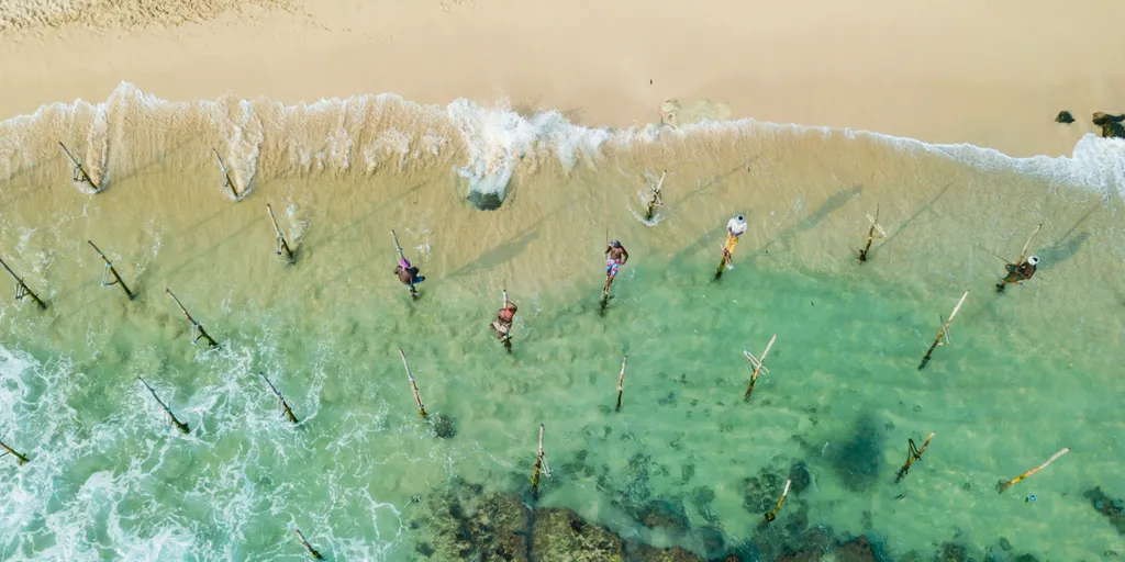 Bordeando en carretera la costa del Índico llegaremos a Weligama, una ciudad sureña donde los pescadores locales, conocidos como "pescadores zancudos", nos enseñarán sus peculiares métodos de pesca. Sentados en una especie de estaca o poste de madera sobre el agua, esperan pacientemente y, llegado el momento, pescan utilizando una caña y redes unidas entre sí.