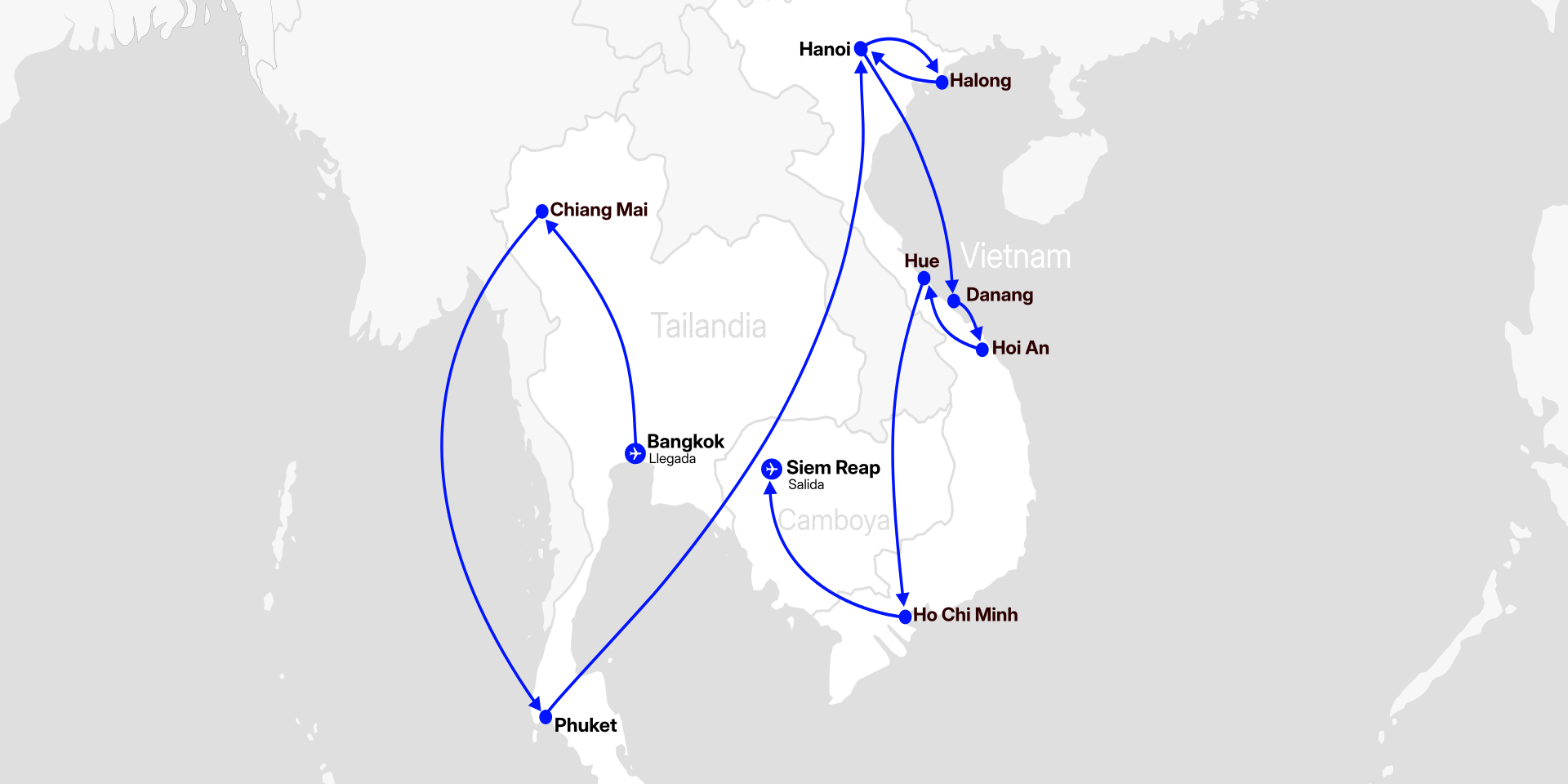Bangkok - Chiang Mai - Phuket - Hanói - Bahía de Halong - Hoi An - Hue - Ho Chi Minh - Siem Reap