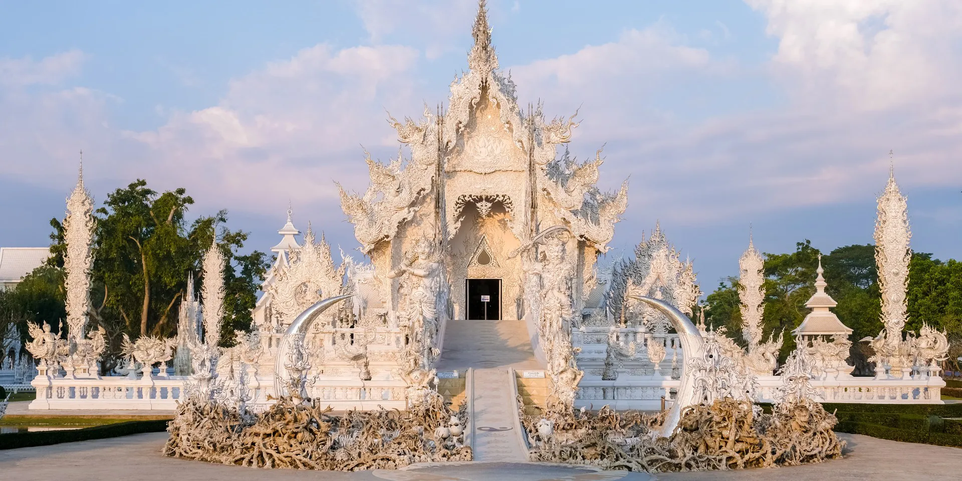Comenzaremos el día navegando el río Maekok en una lancha tradicional tailandesa. El río nos llevará hasta el poblado de la etnia karen. Continuaremos el trayecto hacia Chiang Mai con una parada en el Templo Blanco o Wat Rong Khun, obra que utiliza cristales y un color blanco puro para simbolizar la sabiduría budista. Veremos también el famoso puente blanco, un enclave sagrado para la población budista de la zona.