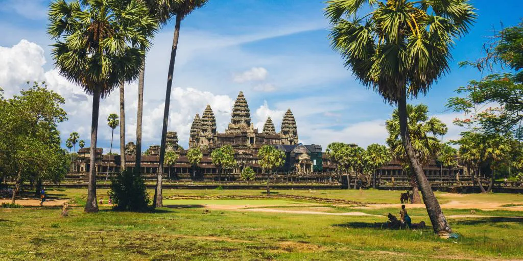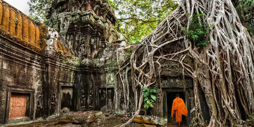 Para recargar energías, haremos una pausa para almorzar. Seguidamente descubriremos el complejo más famoso de la antigua ciudad: Angkor Wat. Además de considerarse el máximo exponente de arquitectura jemer, fue declarado Patrimonio Mundial de la Humanidad por la Unesco. Considerado un símbolo de Camboya, cuenta con una enorme torre y 200 imágenes talladas en sus paredes. El itinerario continúa hacia el Templo Ta Prohm, un impresionante recinto inmerso en la naturaleza. Construido en el siglo XII, ha sido rodeado por las raíces de los árboles cercanos, una imagen que crea un espectáculo impresionante.
