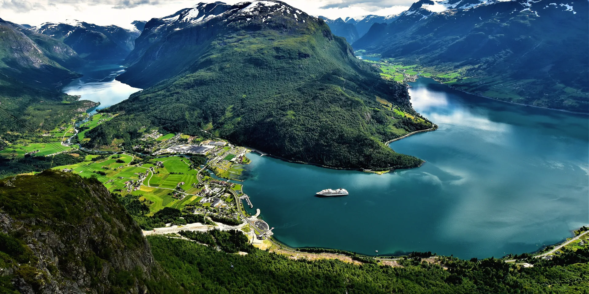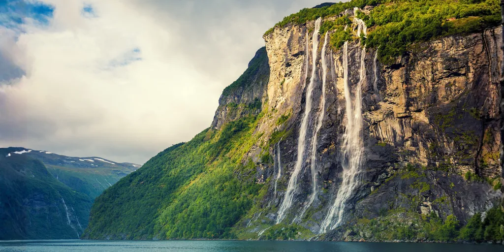 Después del desayuno, nos trasladaremos a Hellesylt para embarcar en un crucero por el Fiordo de Geiranger. Navegaremos por un entorno donde el retroceso de los glaciares esculpió acantilados y admiraremos las cascadas de las Siete Hermanas y El Pretendiente, que caen con fuerza desde las alturas.