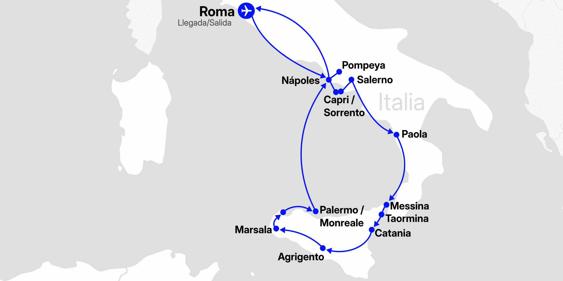 Roma - Nápoles - Capri - Sorrento - Salerno - Paola - Mesina - Taormina - Catania - Caltagirone - Agrigento - Marsala - Erice - Palermo - Monreale - Pompeya - Nápoles - Roma