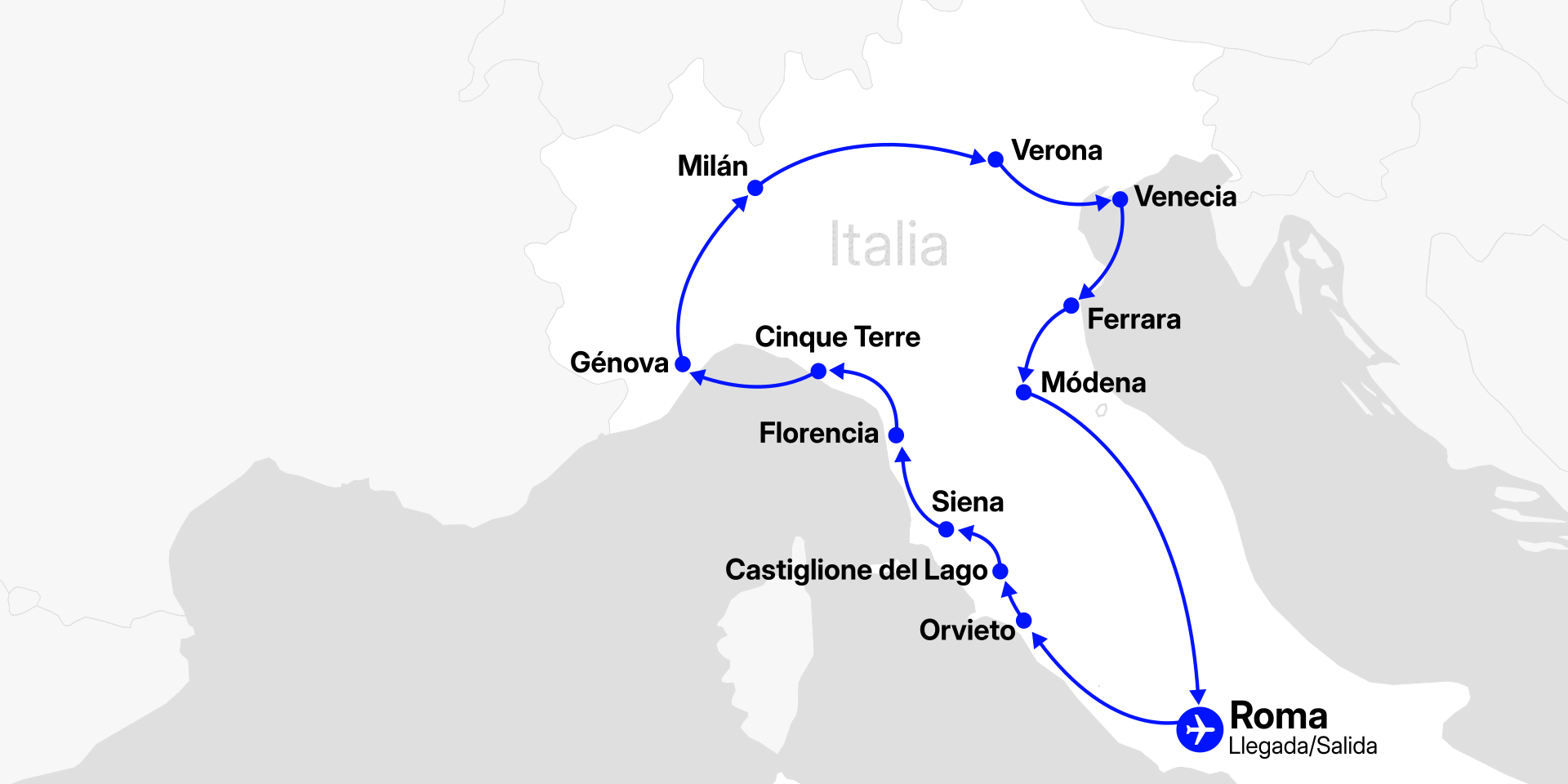 Roma - Orvieto - Castiglione del Lago - Siena - Monteriggioni - San Gimignano - Florencia - Pisa - Cinque Terre - Génova - Portofino - Milán - Región de los Lagos - Verona - Venecia - Ferrara - Módena - Bolonia - Roma