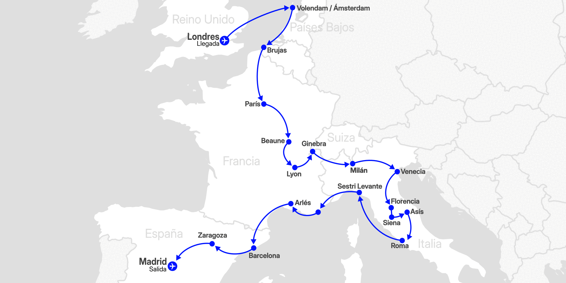 Madrid - San Sebastián - Burdeos - Chambord - París - Beaune - Lyon - Ginebra - Milán - Venecia - Florencia - Siena - Asís - Roma - Pisa - Sestri Levante - Costa Azul - Arlés - Barcelona - Comarca del Penedés - Zaragoza - Madrid