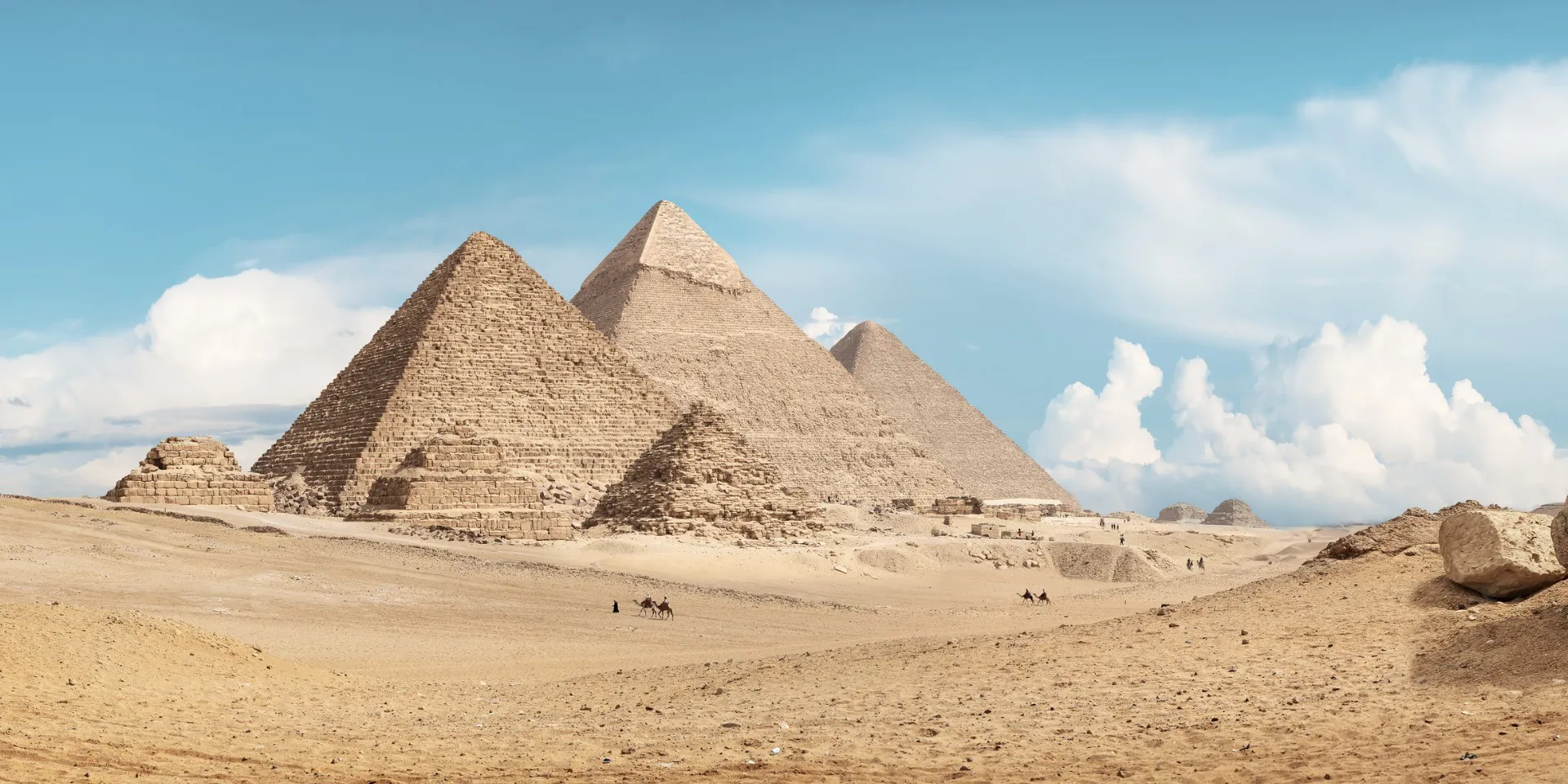 Tras el desayuno, dedicaremos la jornada a descubrir una de las joyas de Egipto: las Pirámides de Guiza. Esta visita panorámica nos permitirá conocer de cerca la magnitud de las tres grandes pirámides de Khufu, Khafra y Menkaura, conocidas comúnmente por su nombre en griego: Keops, Kefrén y Micerinos. Recorreremos el Templo del Valle de Kefrén, espacio en el que se realizaba la preparación de los faraones antes de ser enterrados. También nos asombraremos ante la Gran Esfinge, imponente criatura mitológica de casi 2600 años de antigüedad —mitad humana y mitad león— que custodia los restos de los soberanos que descansan en la meseta.