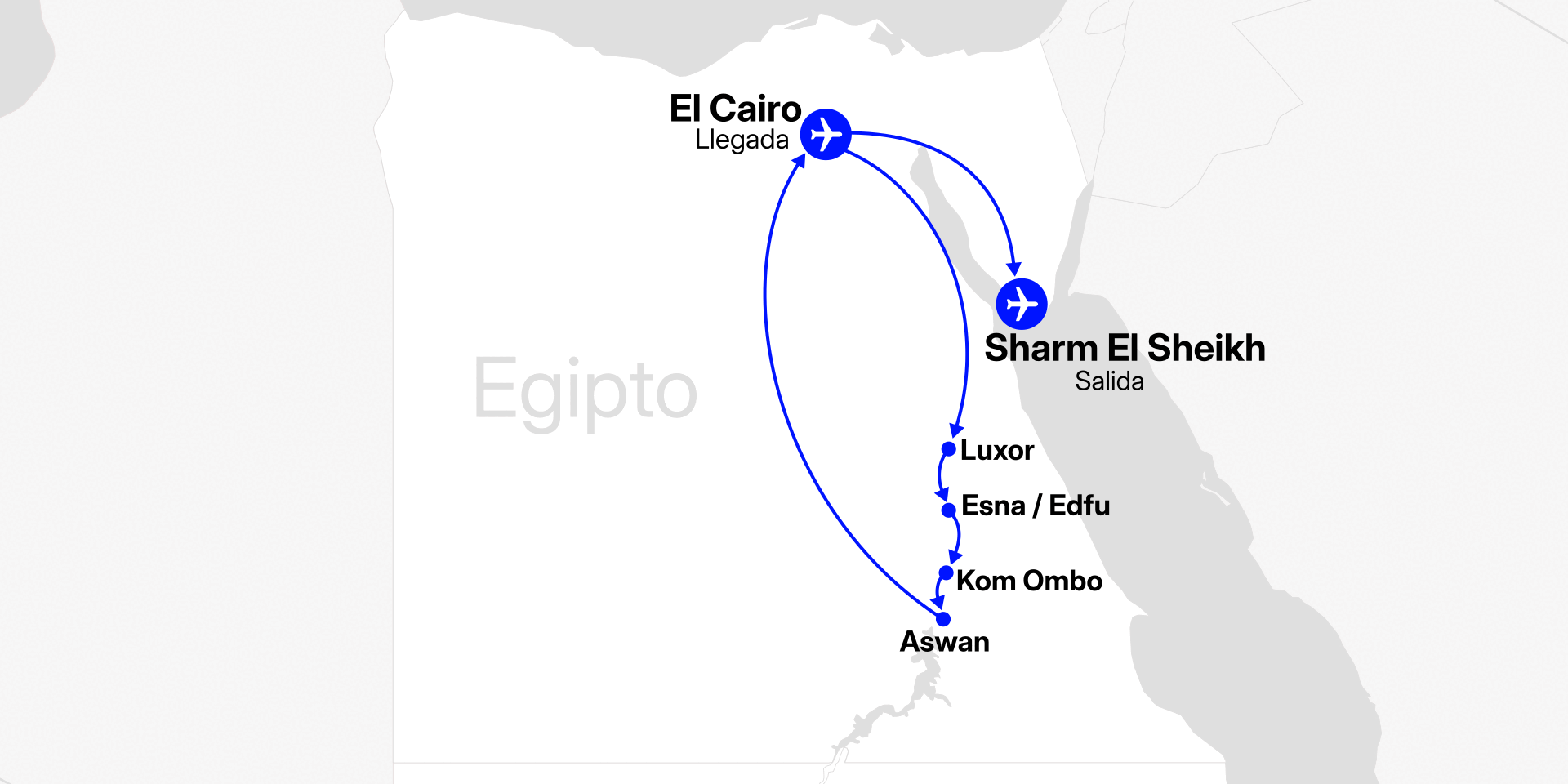 Luxor - Esna - Edfu - Kom Ombo - Aswan - El Cairo - Sharm El Sheikh (el itinerario varía en función del día de llegada).