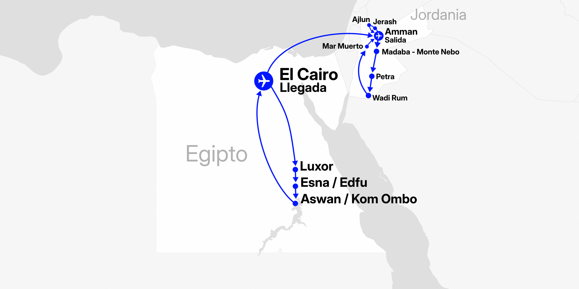 El Cairo - Luxor - Esna - Edfu - Kom Ombo - Aswan - El Cairo - Amman (Amán) - Mar Muerto - Amman (Amán) - Jerash (Gerasa) - Ajlun - Amman (Amán) - Madaba - Monte Nebo - Petra - Wadi Rum - Amman (Amán)