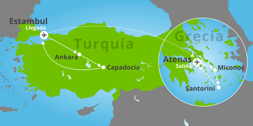 Finalizaremos nuestro viaje a Estambul, Ankara, Capadocia, Atenas, Miconos y Santorini en el aeropuerto de Atenas, donde tomaremos un vuelo hacia España.
