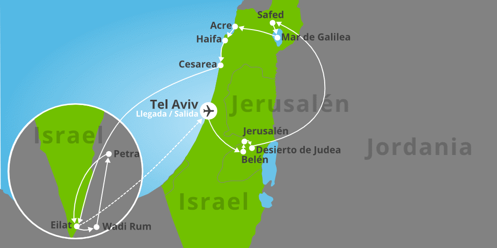 Tel Aviv - Belén - Jerusalén - Desierto de Judea - Safed - Mar de Galilea - Acre - Haifa - Cesarea - Eilat - Wadi Rum - Petra - Eilat - Tel Aviv
