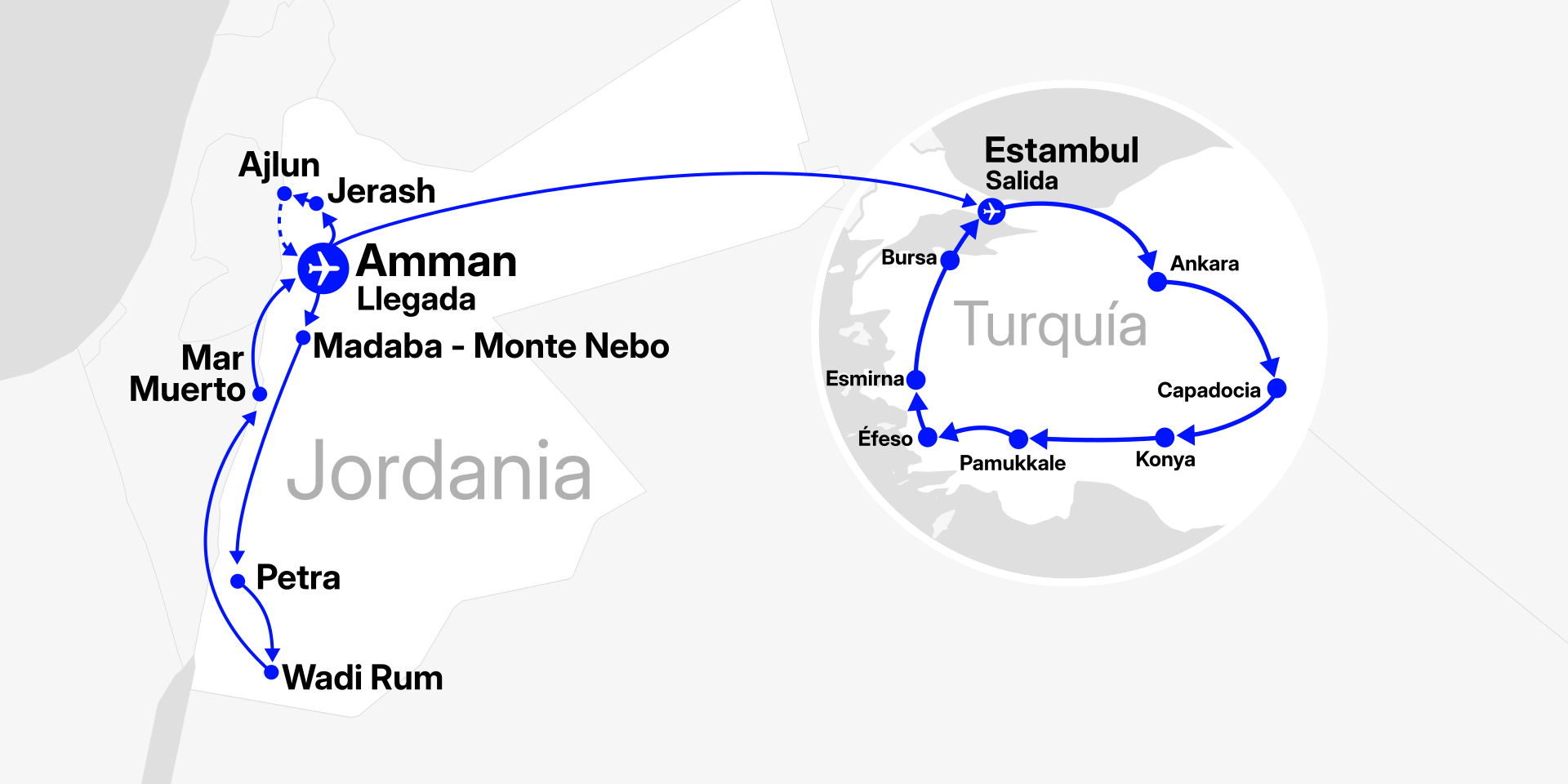 Amman (Amán) - Jerash (Gerasa) - Ajlun - Amman (Amán) - Madaba - Monte Nebo - Petra - Wadi Rum - Mar Muerto - Estambul - Ankara - Capadocia - Pamukkale - Éfeso - Zona de Esmirna - Bursa - Estambul